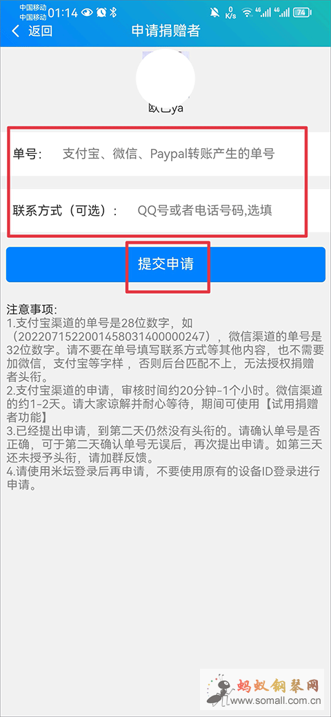 3、然后将转账产生的单号和联系方式填写完成后点击提交申请即可