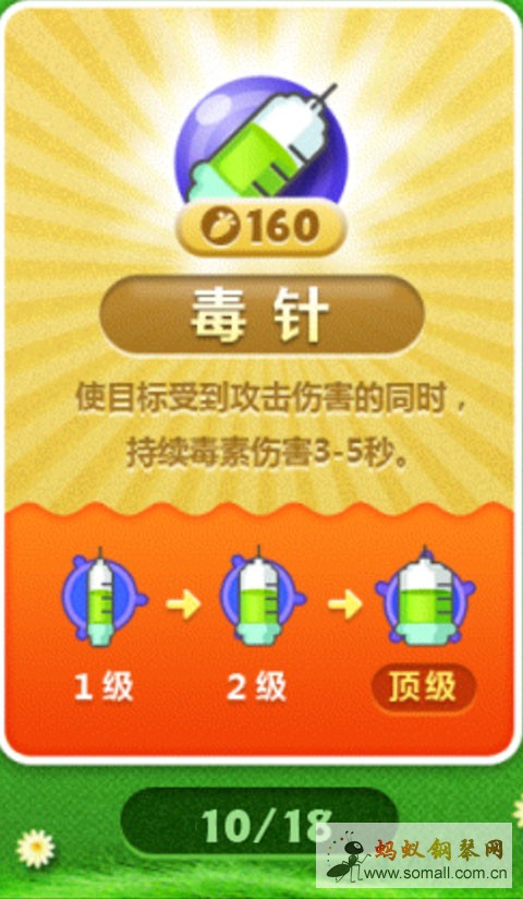 特殊的单体伤害炮塔,特殊属性是持续伤害,在道路较长的地图中较有优势,道路短就基本没用了。因其攻击范围较小,放在边角处可以产生不完美的群伤效果(飞行怪有时能躲过),主要用来清道具及辅助输出。(冬季的第1关几乎就是对毒针进阶用法的教学。)