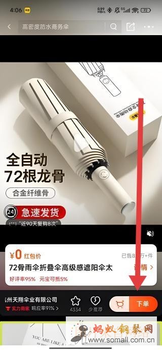 3、在商品详情页,可以通过点击箭头指示下方下单按钮,启动全自动72根龙骨遮阳伞的购买流程。