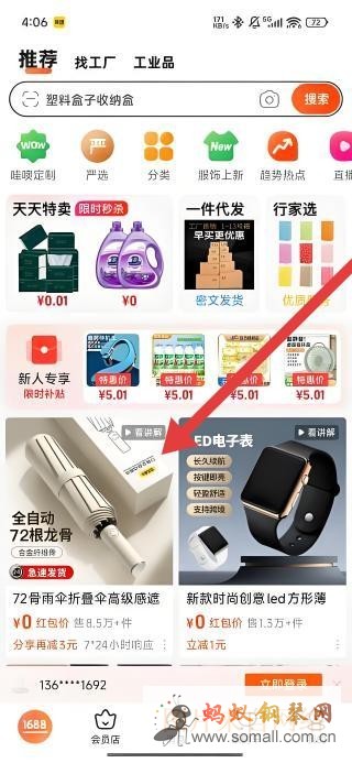 2、在1688首页,可以按照箭头指示点击全自动72根龙骨伞的商品展示区域,进入该商品详情页面。