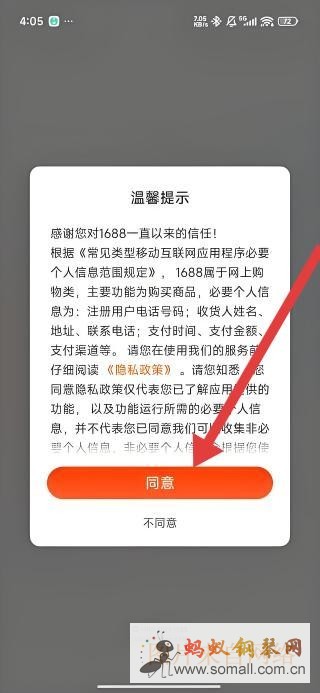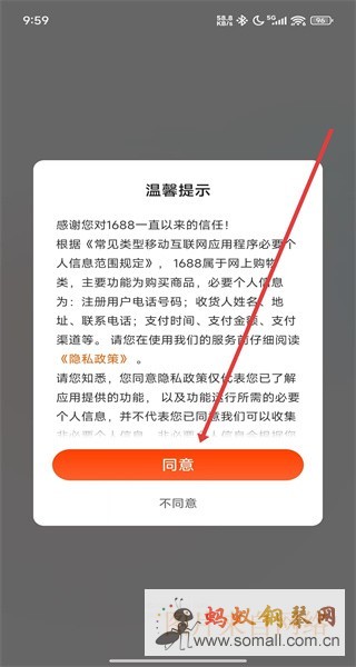 1、打开1688APP,弹出“温馨提示”窗口,点击“同意”。
