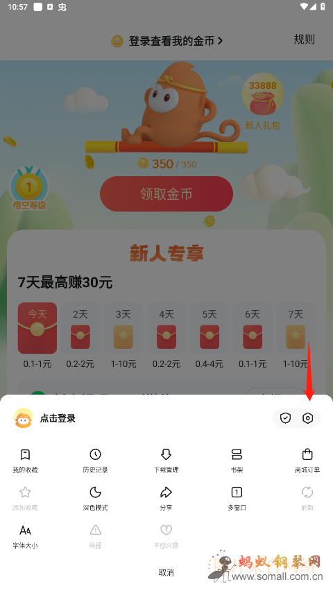 在悟空浏览器APP“我的金币”这页,最上面是可以领自动生成的金币,然后是新人必得3-10元,专享的这七天可以领红包或金币。