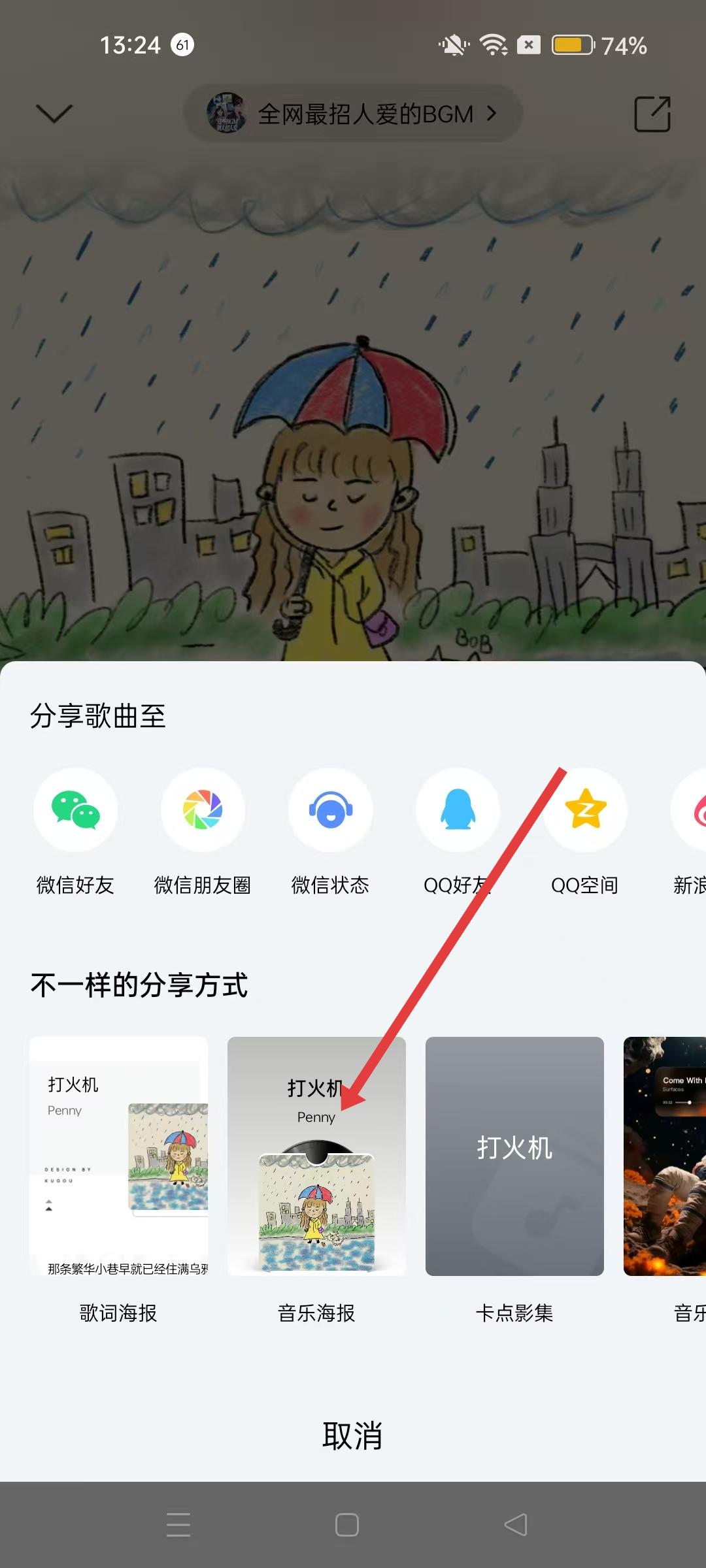 3、分享选项界面,选择音乐海报选项,进入音乐海报制作界面。
