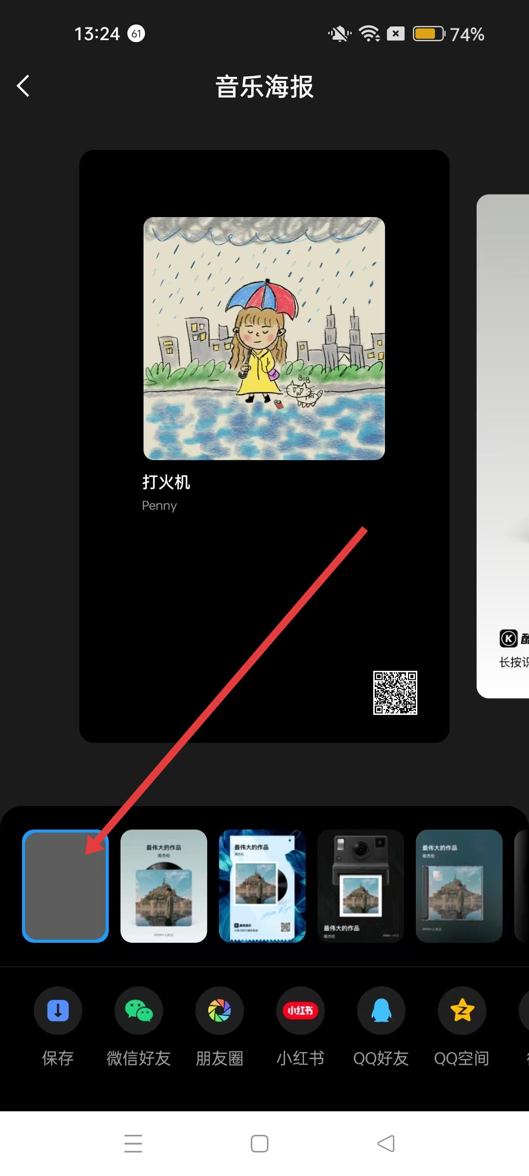 4、音乐海报制作界面,选择喜欢的海报样式,然后点击保存按钮,即可将音乐海报保存到本地,也可选择分享到微信好友、朋友圈等平台。